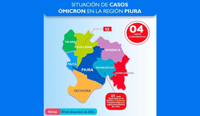 ERP. El director regional de Salud, José Nizama Elías, confirmó el primer caso positivo de una persona con la variante ómicron del Covid-19, en el distrito de la Matanza, Morropón. Se trata de una joven, de 29 años de edad, que cuenta con dosis de la vacuna contra la Covid-19 y que retornó de la ciudad de Lima el día 22 de diciembre a través de trasporte terrestre (ómnibus). El día 27 de diciembre se le realizó una prueba en el hospital de Chulucanas, la cual arrojó positivo para la nueva variante.